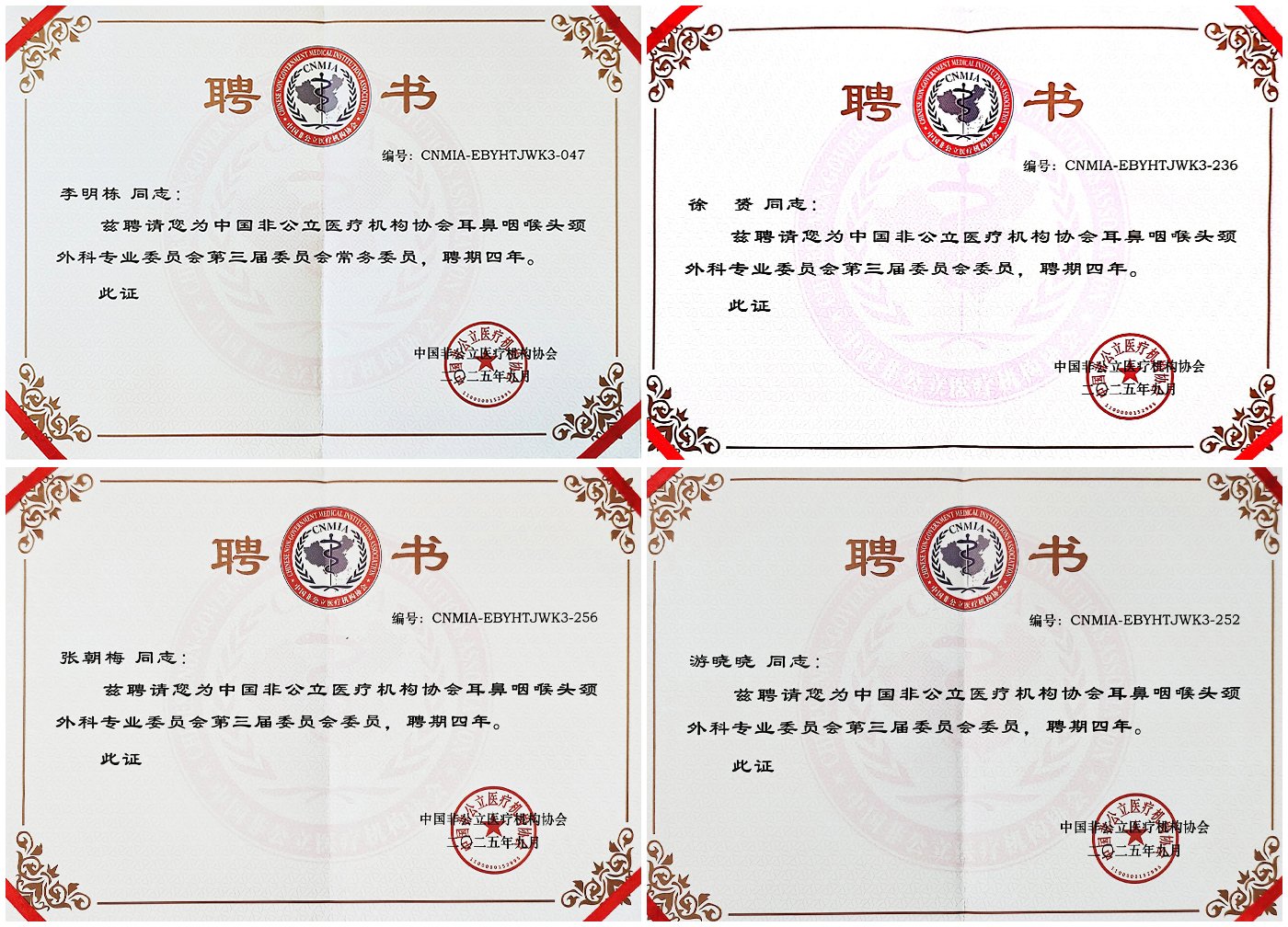 鼻科主任李明栋当选中国非公立医疗机构协会耳鼻咽喉头颈外科专业委员会第三届委员会常务委员;耳科主任张朝梅、咽喉头颈外科主任徐赟、住院部医生游晓晓当选为委员。