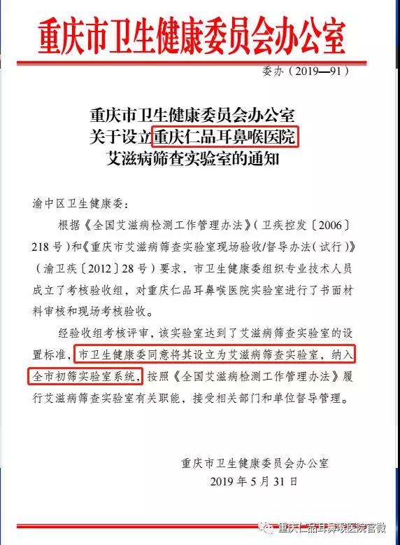 据悉,今年1月,由重庆市卫健委疾控处、市疾控中心病原微生物检验所专家组成的评审组已对该实验室进行了实地考察和评审。评审专家组通过听取汇报、现场提问、资料审核、现场盲样样本的检测等方式,对我院艾滋病筛查实验室HIV抗体检测的环境、布局、操作流程及生物安全防护措施、人员资质、质量控制、技术水平等情况进行了严格评审。评定为已具备艾滋病筛查实验室的条件和检测能力。日前,重庆仁品耳鼻喉医院收到了重庆市卫生健康委员会下发的《关于设立重庆仁品耳鼻喉医院艾滋病筛查实验室的通知》。