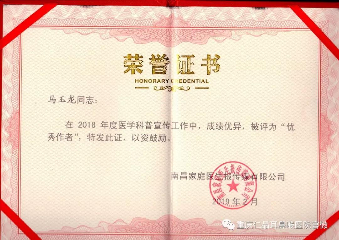 近日,重庆仁品耳鼻喉医院咽喉科、儿童耳鼻喉科、嗓音中心主任马玉龙被《家庭医生报》评为2018年度“优秀作者”。