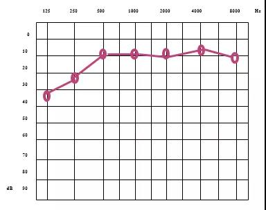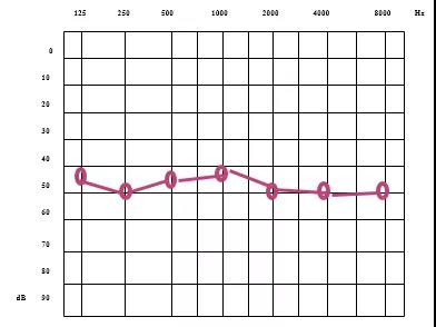平坦下降型:所有频率听力均下降,250~8000Hz(250、500、1000、2000、3000、4000、8000Hz)平均听阈≤80dBHL。