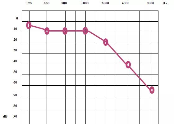高频下降型:2000Hz(含)以上频率听力下降,至少4000、8000Hz处听力损失≥20dBHL。