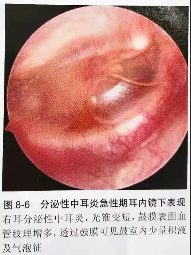 急性期耳内镜下可见鼓膜充血、内陷、光锥变短或消失(图8-6);出现鼓室积液时,鼓膜失去正常光泽,呈淡黄、橙红或琥珀色(图8-7),慢性者鼓膜呈乳白色或灰蓝色,浆液性液体未充满鼓室时可见气液平面及气泡征。