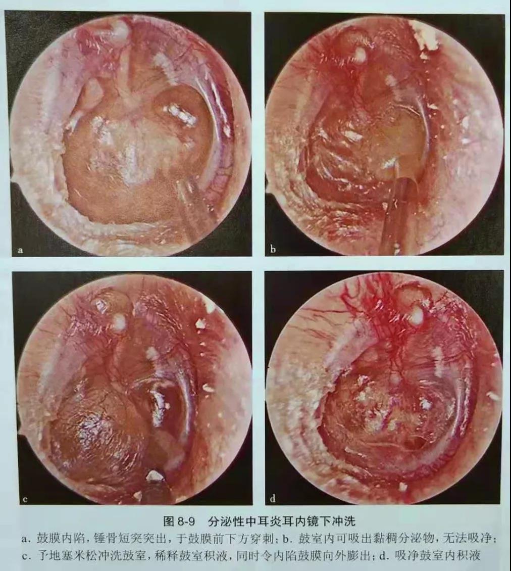 耳内镜相对于传统耳科检查手段在分泌性中耳炎的治疗诊断方面有明显的优势,部分分泌性中耳炎患者鼓膜增厚,鼓室积液稀薄,传统耳科检查较难判断是否有中耳积液。耳内镜下可行诊断性鼓膜穿刺(图8-8),抽出淡黄色积液再结合病史、声导抗检查即可确诊,同时可以缓解患者耳闷症状,提高患者听力。若鼓室积液黏稠,难以抽出,需行鼓膜切开术,并以地塞米松冲洗鼓室(图8-9)。