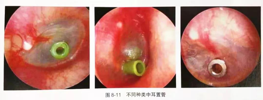 若患者3月后仍有积液或出现鼓膜菲薄、内陷、甚至粘连等情况,或听力下降大于40dB,则需行中耳置管。(图8-11)。对不同鼓膜病变可采取不同方法进行干预,具体参见本章第四、五节。若患者同时出现鼻塞、打鼾等因腺样体肥大所致的上呼吸道梗阻表现,可同期行腺样体切除术。