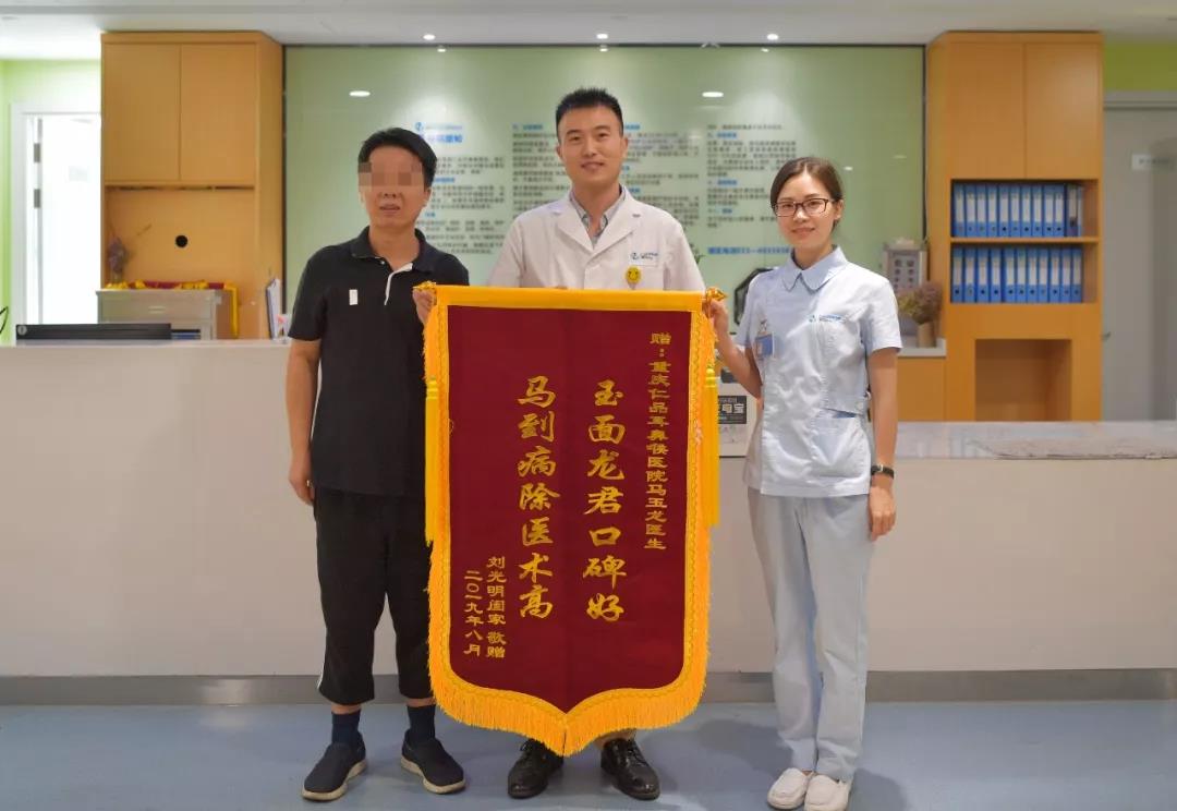 日前,重庆仁品耳鼻喉医院一病区19床患者刘老师将一面印有“玉面龙君口碑好、马到病除医术高”的“藏名”锦旗送到马玉龙主任手中,再三感谢马主任医品好、人品好、医术高,对医护人员的精心治疗和优质服务也是连连称赞,并称这次看病还解除了他对非公立医院的误会!