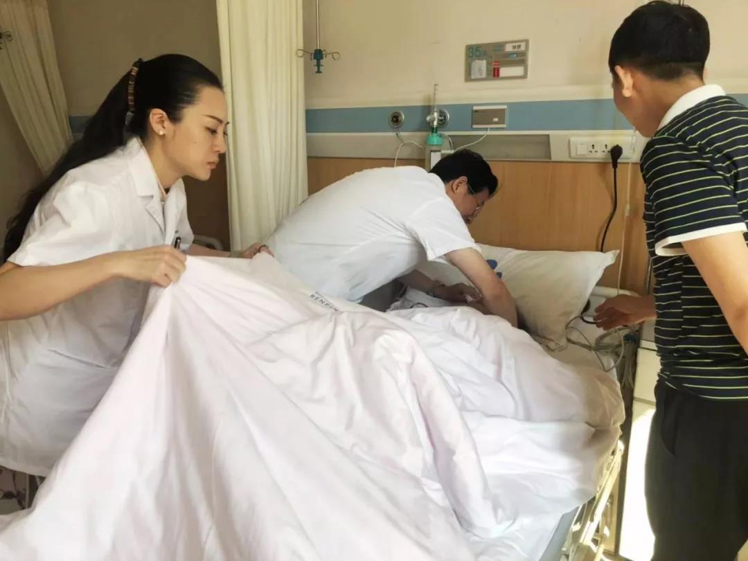 李红见状,加快了脚步上前为患者整理床铺,查看伤口,并叮嘱患者不用害怕,手脚都可以活动,这样躺久了会不舒服。