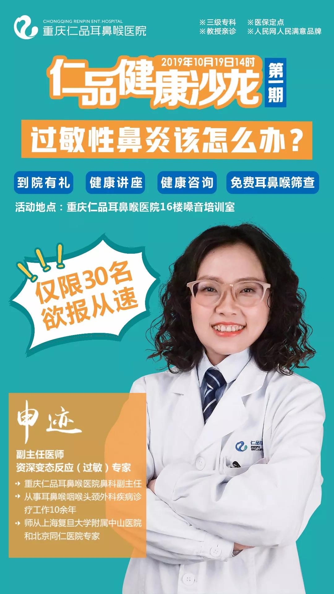 为了普及鼻炎预防及调理知识,增强大家对过敏性鼻炎的防护意识,重庆仁品耳鼻喉医院定于10月19日下午14点举办“仁品健康沙龙”活动,活动现场还有免费耳鼻喉筛查项目,让我们与您携手,共同对付过敏性鼻炎!欢迎患者朋友积极报名参加!